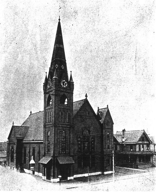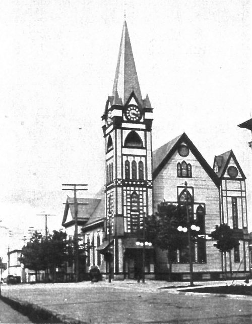 The fifth church building was again built on the same foundation and looked almost identical to the previous structure. Minor changes were made to make the building more substantial and fireproof. The basement was finished with Sunday school classes and a room for social events. The town clock and bell that were in the previous church were replaced by the city. For a third time the church building burned down in 1913, caused by a switchboard behind the Moller pipe organ.